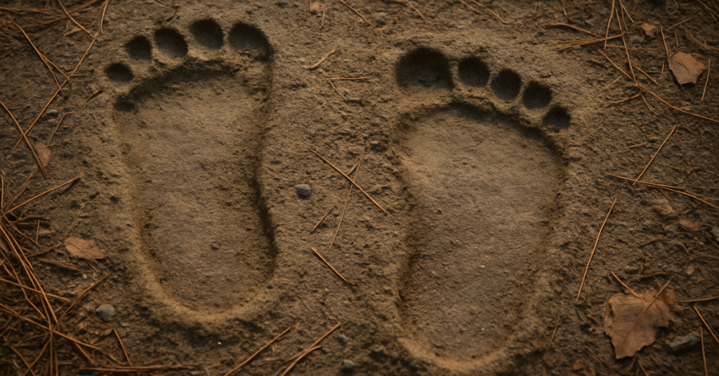 Footprints with mid-tarsal breaks, dermal ridges, and step lengths too large to fake. These match primate anatomy but not human structure.